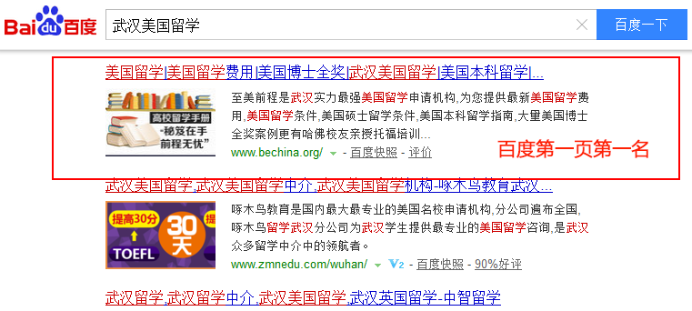 關(guān)鍵詞“武漢美國留學”在百度排名:第1頁第1名