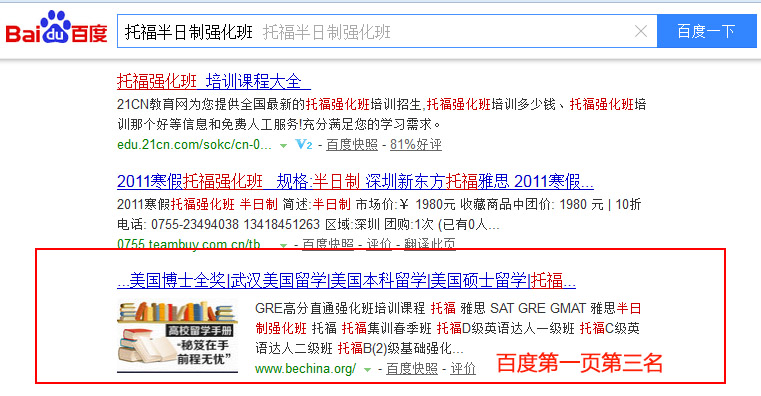 關(guān)鍵詞“托福半日制強化班”在百度排名:第1頁第3名