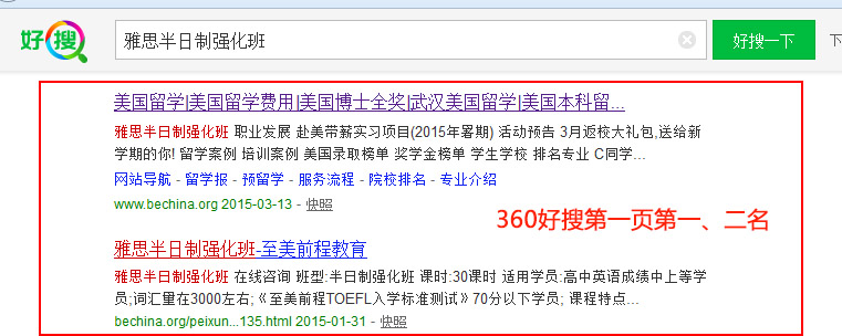 關(guān)鍵詞“雅思半日制強化班”在好搜排名:第1頁第2、3名