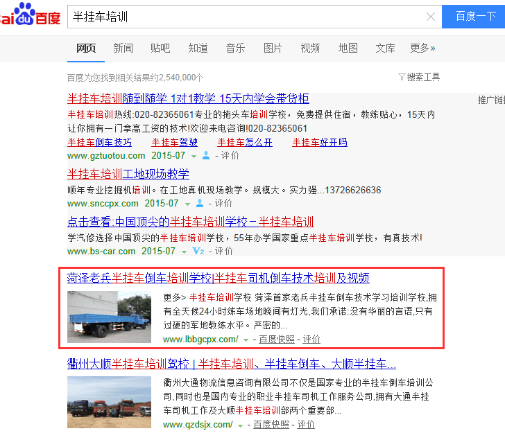 關(guān)鍵詞“半掛車培訓(xùn)”在百度排名:第1頁(yè)第1名