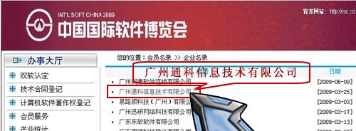 您可以進(jìn)入“廣州市軟件行業(yè)協(xié)會(huì)”網(wǎng)站: http://www.gzsa.org,點(diǎn)擊“會(huì)員名錄”,進(jìn)入“ http://www.gzsa.org:81/membership.do?mhd=toListInWeb2&sortNum1=0601”,可以非常清楚的看到“廣州通科信息技術(shù)有限公司 ”的有關(guān)信息。